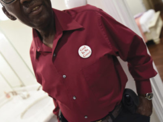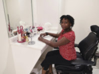 I have to admit that when I went to meet with Yolanda, I had no idea what to expect. As I visited with Mr. and Mrs. Strong in their living room, Yolanda came around the corner to greet us. She was stunningly beautiful with the biggest smile on her face. She was dressed to the nines, with her makeup done perfectly and her jewelry sparkling. I was blown away. She was picture perfect. She asked, “Where do you want me?” She proudly got up and walked, with the help of her prosthetics, to her have her picture made. At first, she was a little hesitant to show us her bathroom and have photos taken, but once we got in there she lit up and was so proud of her space! And boy was it beautiful!