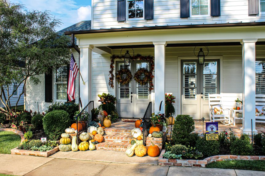 Use natural materials—pinecones, gourds, and branches—to blend your porch into the season. Their recent fall porchscape for a Shreveport home combined stacked pumpkins, baskets of mums, and twinkling lanterns, creating a space that felt like autumn’s embrace.